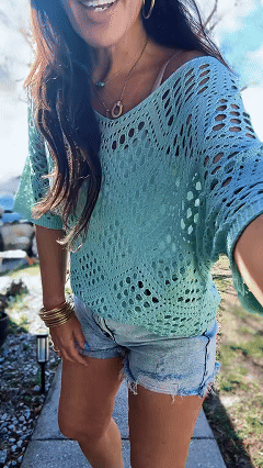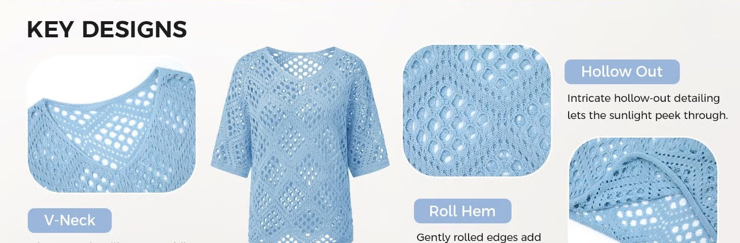 - Design: Short sleeves, hollow-out crochet, V-neck, and loose fit